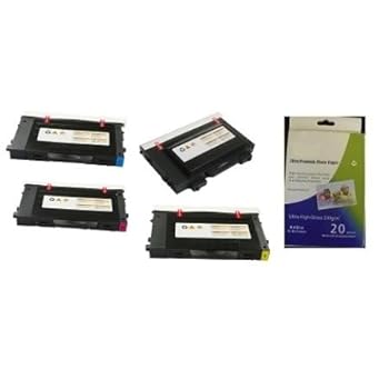 ValuePack Set (4 Count): Includes EXPEDITED SHIPPING AT CHECKOUT With Standard Yield Replacement Samsung Toner Cartridge for select Printers / Faxes Compatible with Samsung CLP: 500, 550n, 550, 550n - Includes 1 Set of BLACK, MAGENTA, YELLOW and CYAN Remanufactured Cartridges plus 1 Package of 20 sheets, 4 x 6 inch Glossy Photo Papers