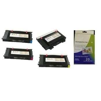 ValuePack Set (4 Count): Includes EXPEDITED SHIPPING AT CHECKOUT With Standard Yield Replacement Samsung Toner Cartridge for select Printers / Faxes Compatible with Samsung CLP: 510, 510n - Includes 1 Set of BLACK, MAGENTA, YELLOW and CYAN Remanufactured Cartridges plus 1 Package of 20 sheets, 4 x 6 inch Glossy Photo Papers